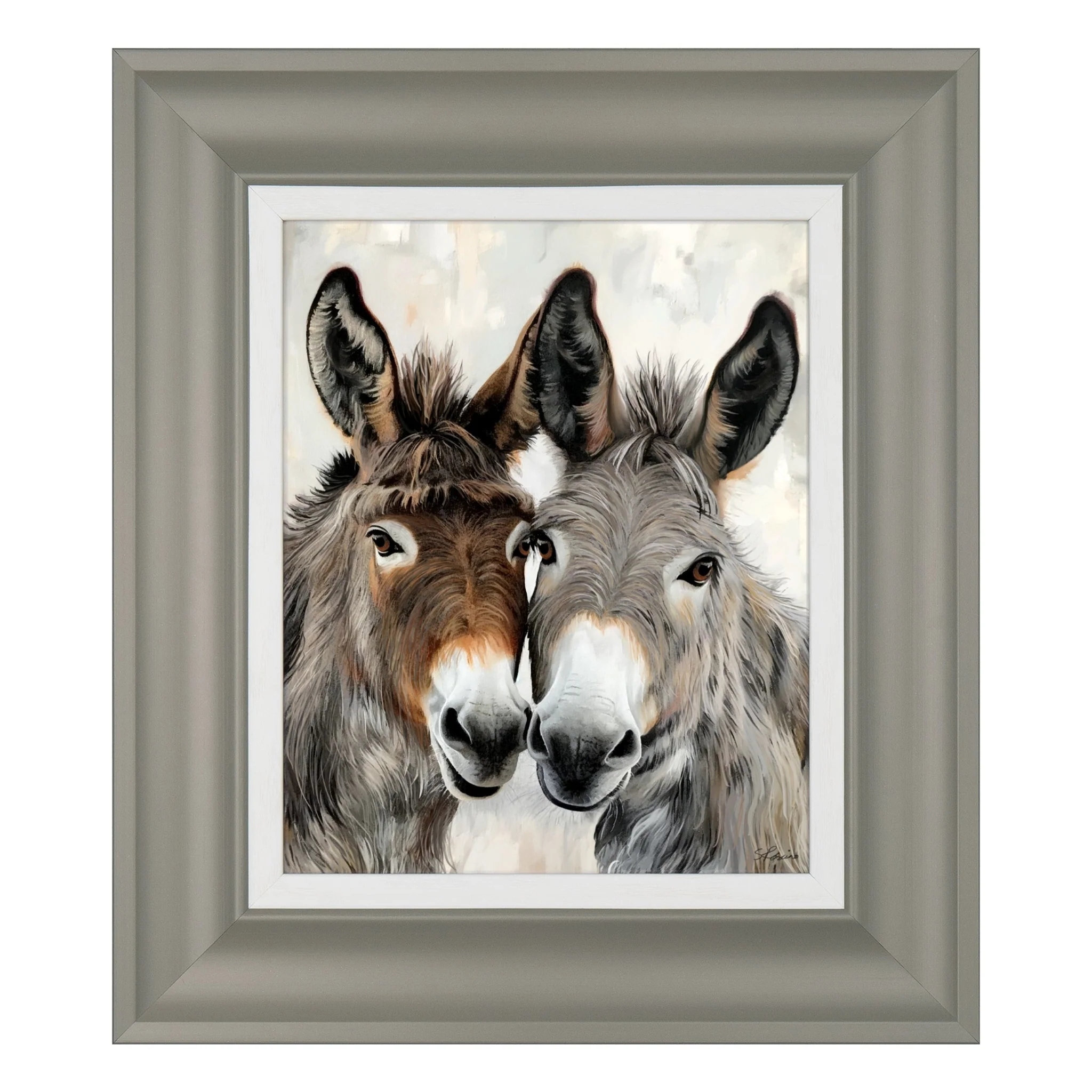 A charming pair of alpacas and two sweet donkeys gaze affectionately at the viewer. Sabrina Roscini employs soft brush strokes to meticulously depict the personalities of each animal, capturing their characters through their distinctive coats and eyes. With their joyful gaze, these cute animals will surely bring a smile to your face.