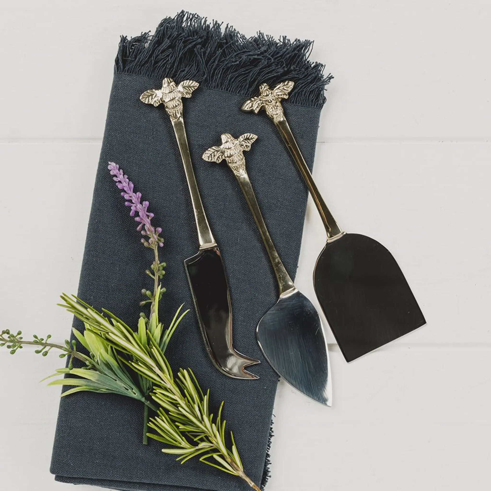 This beautiful trio of cheese knives is sure to look great arranged next to your slate or oak cheese board. With their fun, gold bee designed handles and different shaped blades these knives will help you serve a variety of your favourite cheeses with ease, and in incredible style!